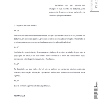 A matéria do deputado estabelece cota de 10% para pessoas em situação de rua nos cargo, emprego ou funções na administração pública federal. Para isso, precisam fazer a inscrição no Cadastro Único (Cadúnico).